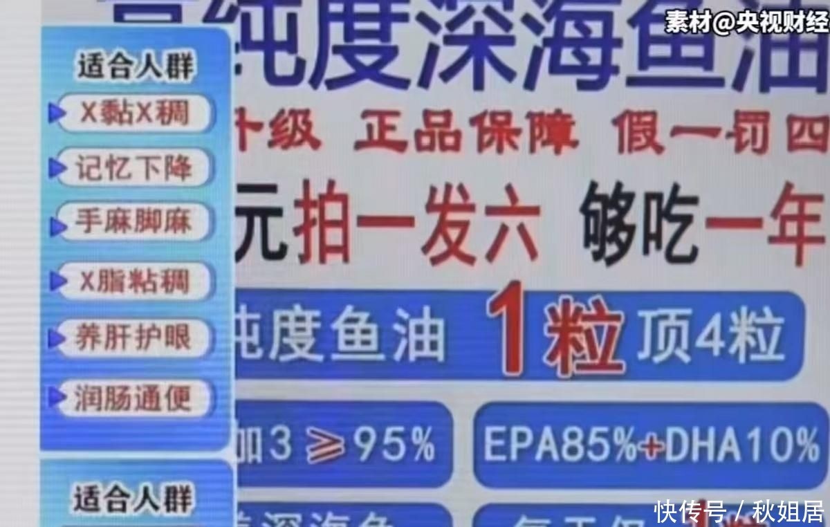 她说得特别肯定,说这鱼油能治头晕头痛、手麻脚麻,还能改善记忆力下降,讲完还反复强调 “央视推荐,绝对有保障”。