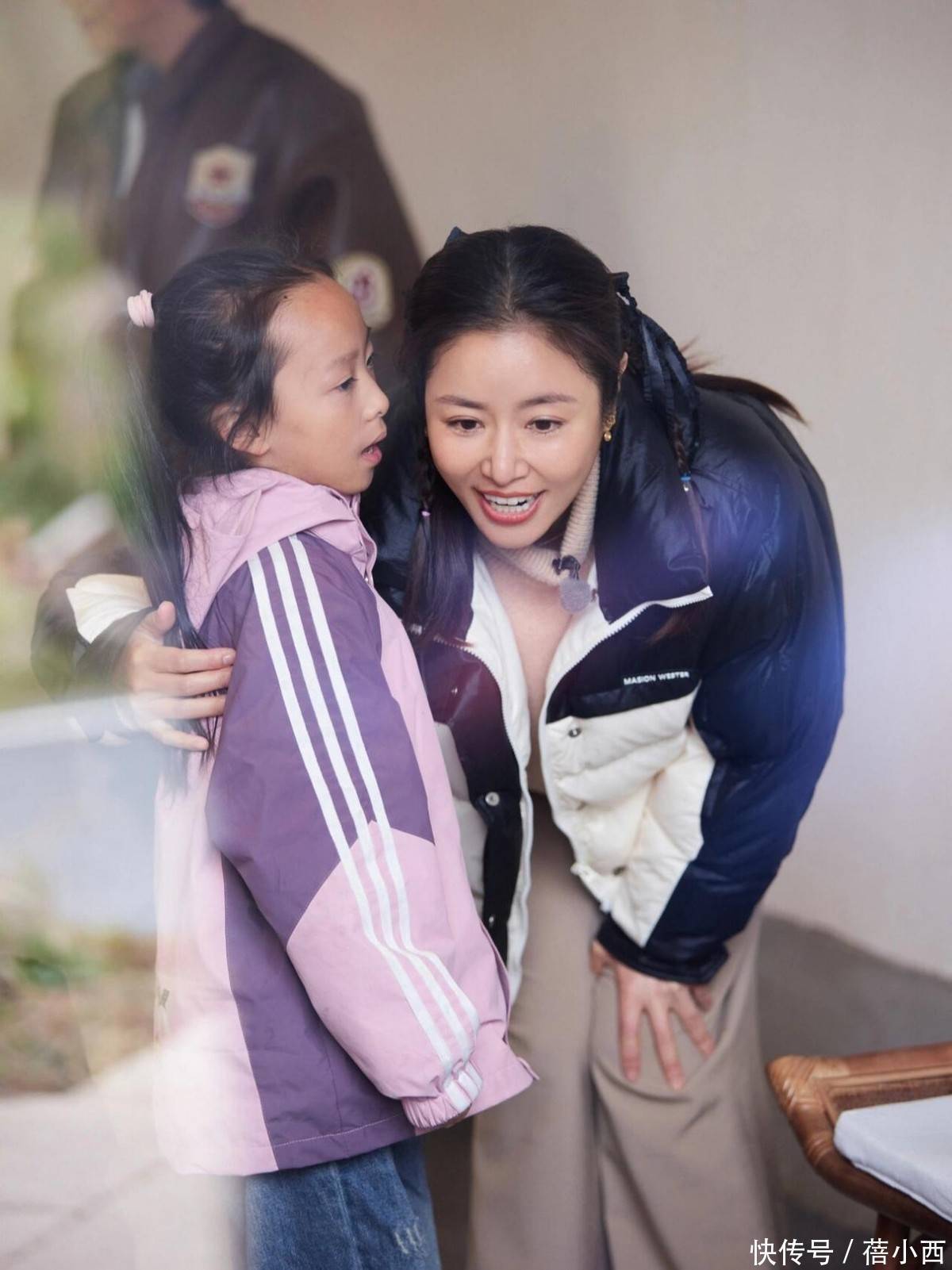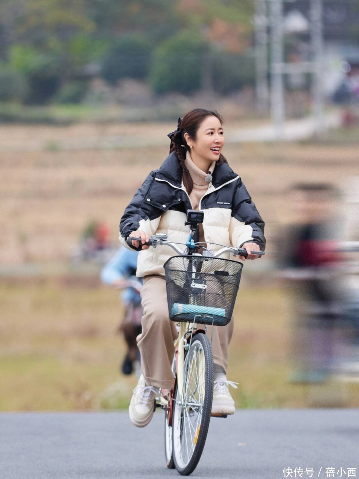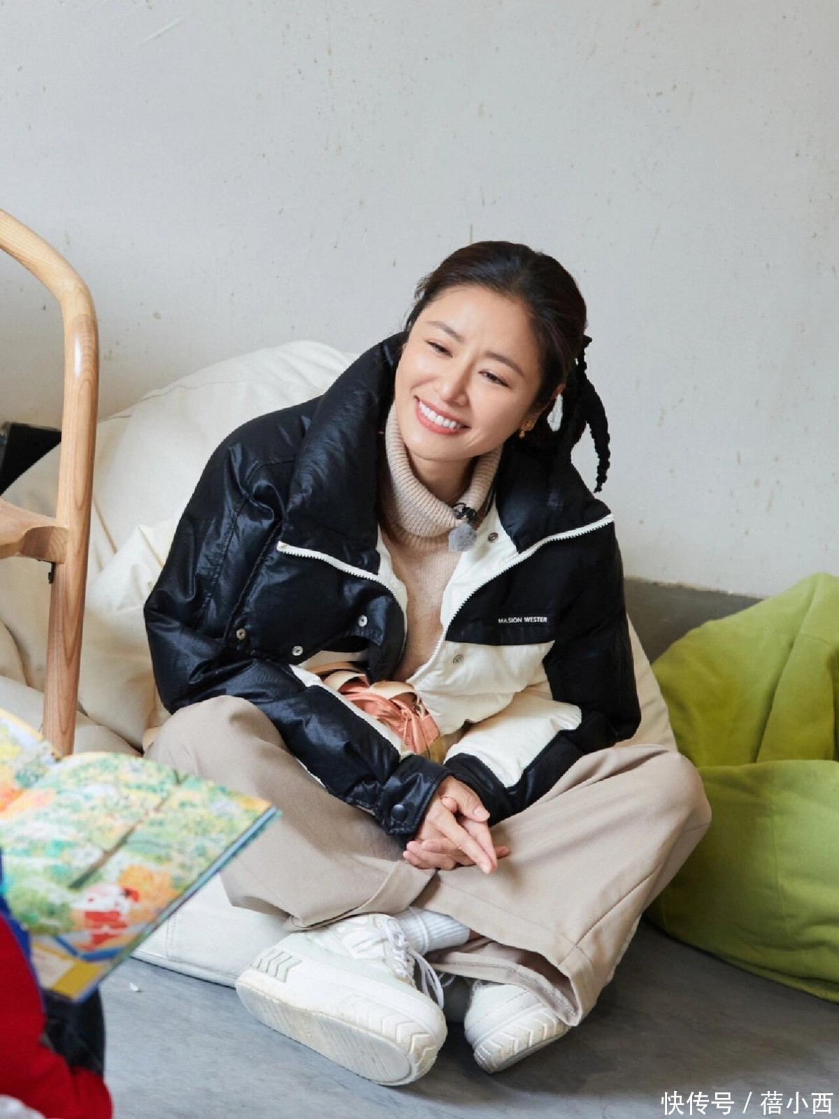 宽松的阔腿裤与蓬松的羽绒服形成呼应,既藏住了腰腹赘肉,又在视觉上拉长了腿部线条,再搭配小白鞋,简约还随性,这一身搭配时髦还实用,她没有刻意追求少女感,而是用简约配色与舒适版型,诠释了40+女性的从容与舒展。