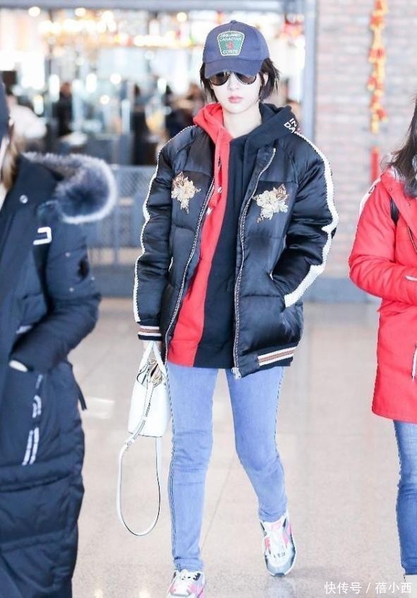 下身搭配修身牛仔裤,脚上的拼色运动鞋让整体风格更显活力,她没有用半身裙刻意营造“甜妹感”,而是用卫衣+牛仔裤的组合,让羽绒服跳出了“土气”的标签,显得活力满满,更妙的是修身的牛仔裤修饰了她的身材比例,看起来比例很好,冬季也能避免臃肿感。
